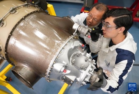 在香港專業(yè)教育學(xué)院,黃富東(右)在檢查渦輪螺旋槳飛機(jī)引擎(1月14日攝)。新華社發(fā)(王申攝)
