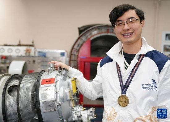在香港專業(yè)教育學(xué)院,黃富東佩戴著“2024年里昂世界技能大賽”飛機(jī)維修項(xiàng)目的銅牌和渦輪螺旋槳飛機(jī)引擎合影(1月14日攝)。新華社發(fā)(王申攝)