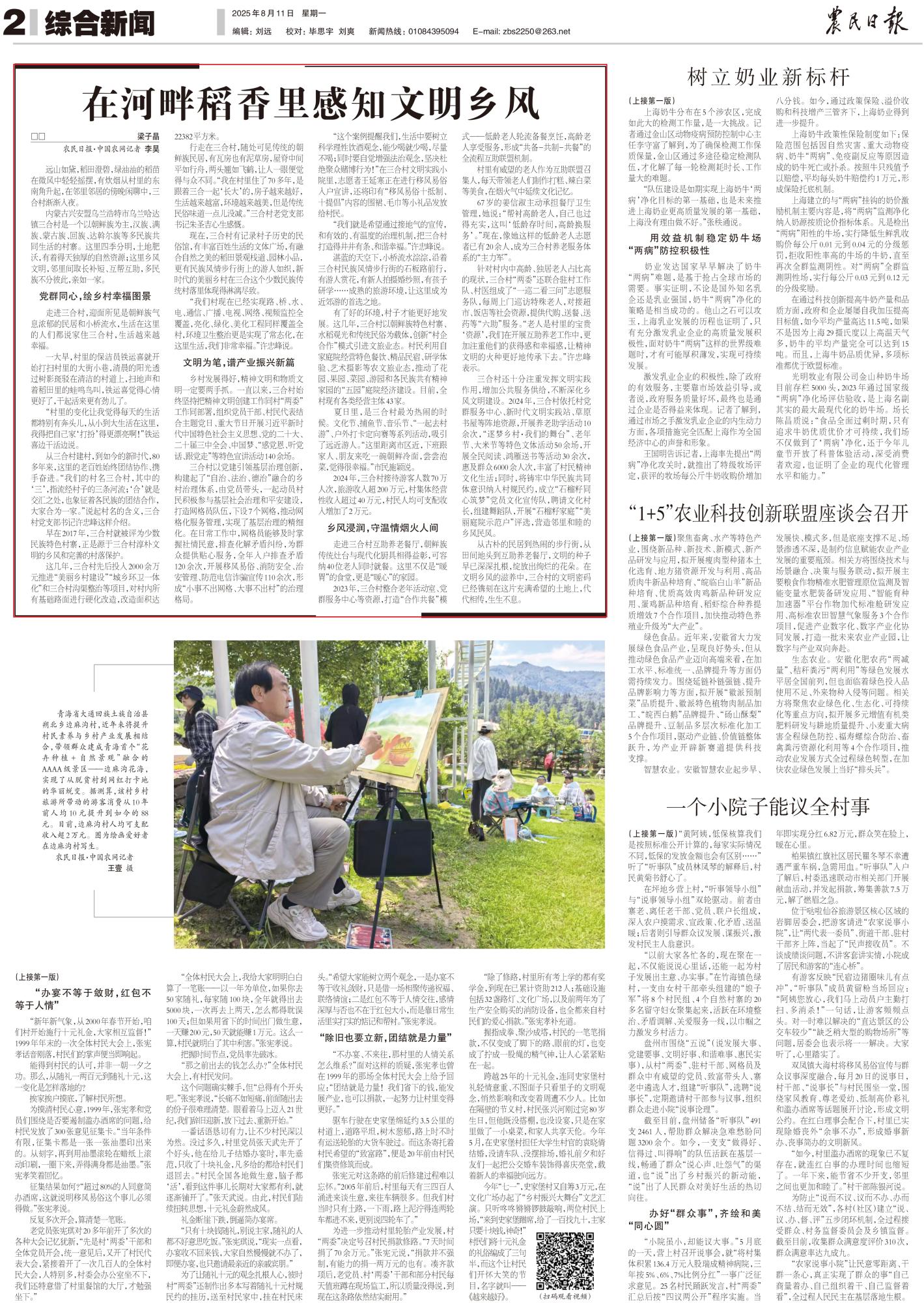 2025年8月11日,《農(nóng)民日報(bào)》第2版刊發(fā)題為《在河畔稻香里感知文明鄉(xiāng)風(fēng)》的文章,報(bào)道了內(nèi)蒙古興安盟烏蘭浩特市烏蘭哈達(dá)鎮(zhèn)三合村是一個(gè)以朝鮮族為主,漢族、滿族、蒙古族、回族、達(dá)斡爾族等多民族共同生活的村寨。這里四季分明,土地肥沃,有著得天獨(dú)厚的自然資源;這里鄉(xiāng)風(fēng)文明,鄰里間取長補(bǔ)短、互幫互助,多民族不分彼此,親如一家。