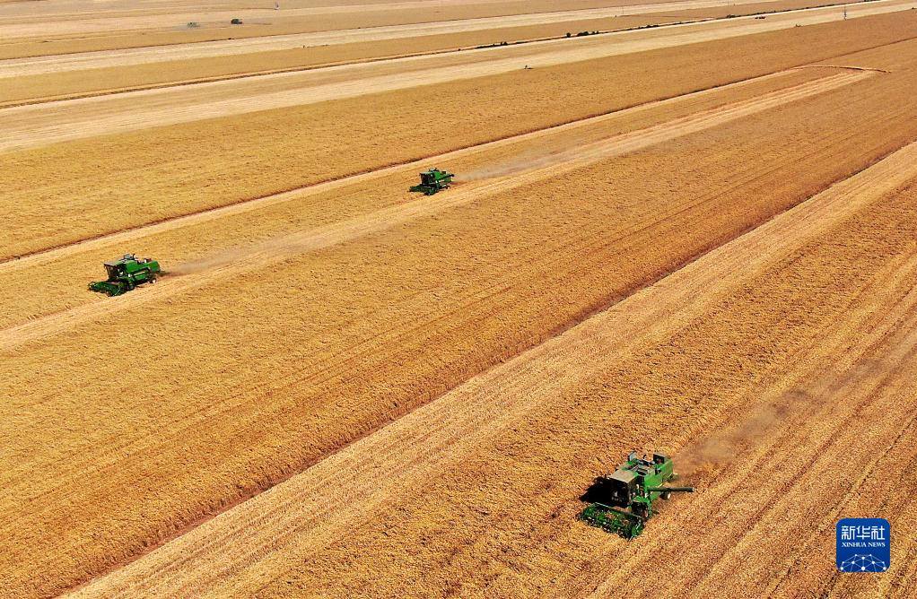 在河南省黃泛區(qū)農(nóng)場(chǎng)九分場(chǎng)的麥田里,農(nóng)機(jī)手操作收割機(jī)收獲小麥(無(wú)人機(jī)照片,2021年6月6日攝)。新華社記者李安攝