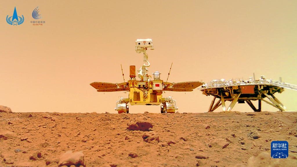 這是“著巡合影”圖。2021年6月11日,國(guó)家航天局在北京舉行天問一號(hào)探測(cè)器著陸火星首批科學(xué)影像圖揭幕儀式,公布了由祝融號(hào)火星車拍攝的著陸點(diǎn)全景、火星地形地貌、“中國(guó)印跡”和“著巡合影”等影像圖。首批科學(xué)影像圖的發(fā)布,標(biāo)志著我國(guó)首次火星探測(cè)任務(wù)取得圓滿成功。新華社發(fā)(國(guó)家航天局供圖)