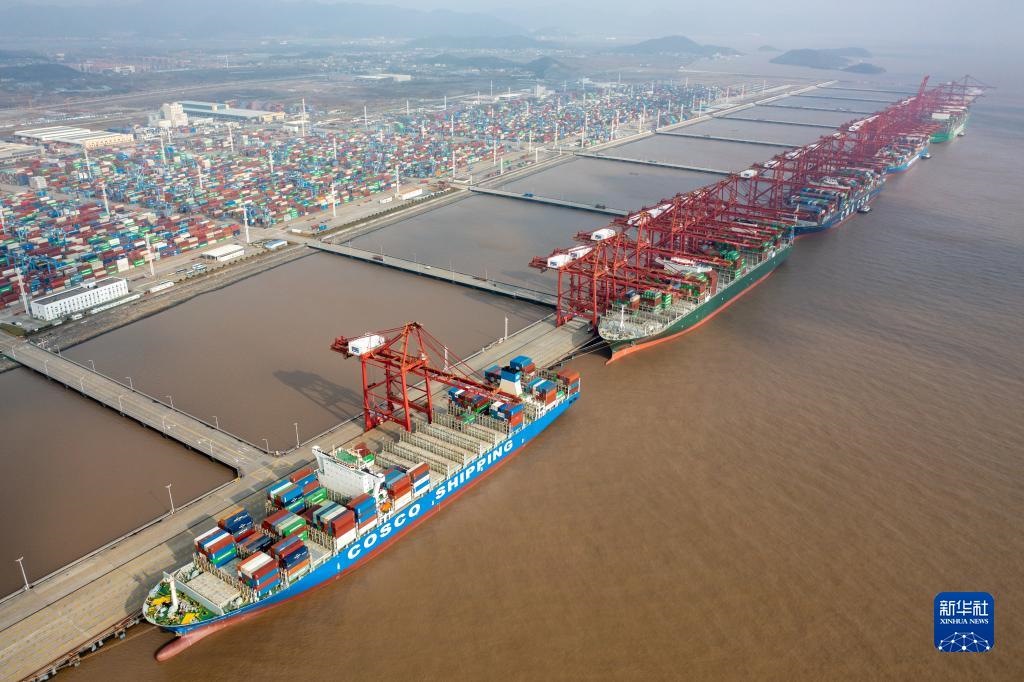浙江寧波舟山港梅山港區(qū)集裝箱碼頭一派繁忙景象(2021年12月17日攝,無(wú)人機(jī)照片)。新華社發(fā)(蔣曉東攝)