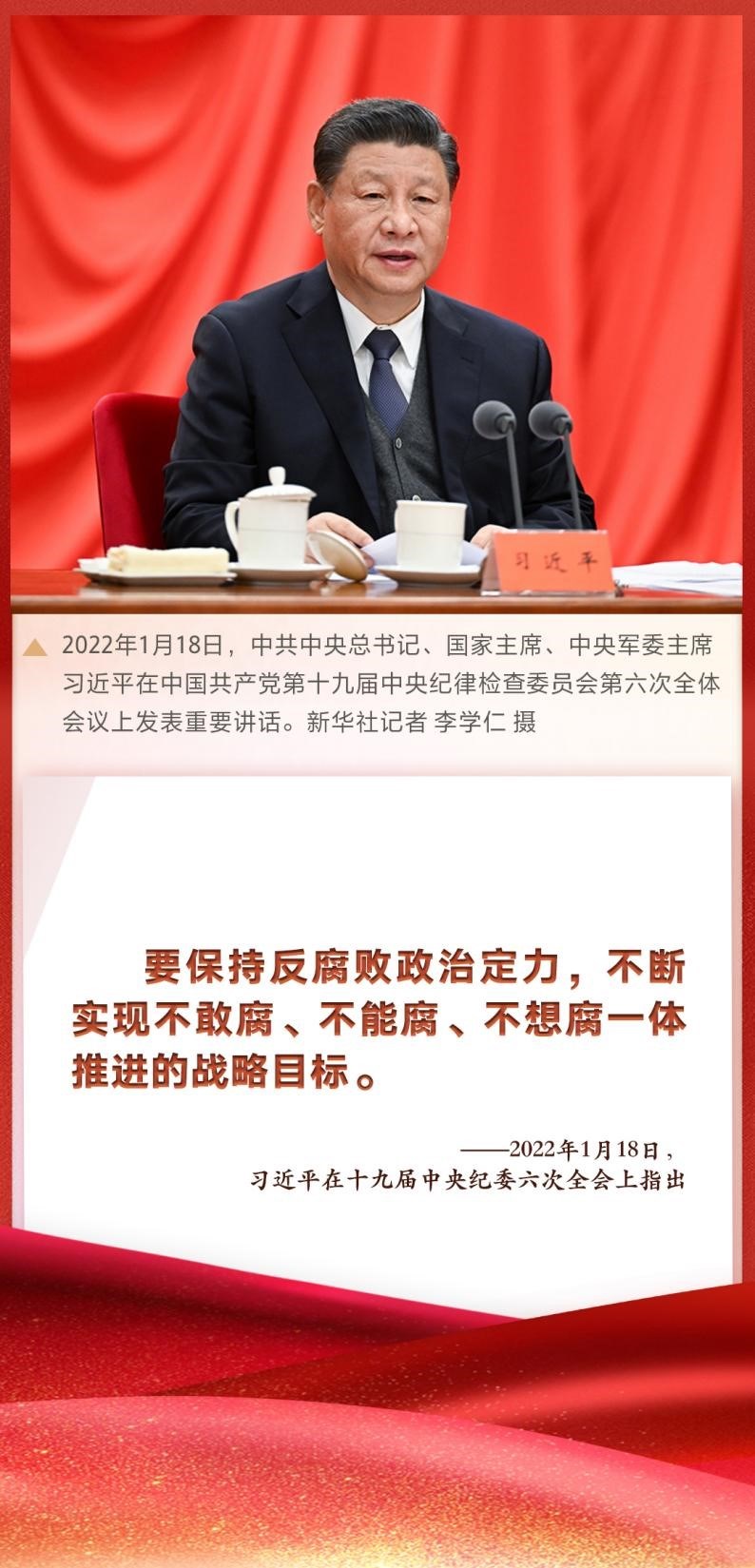 “要保持反腐敗政治定力,不斷實(shí)現(xiàn)不敢腐、不能腐、不想腐一體推進(jìn)的戰(zhàn)略目標(biāo)?!敝泄仓醒肟倳?shū)記、國(guó)家主席、中央軍委主席習(xí)近平在十九屆中央紀(jì)委六次全會(huì)上發(fā)表重要講話,深刻總結(jié)新時(shí)代黨的自我革命的成功實(shí)踐,深刻闡述全面從嚴(yán)治黨取得的歷史性、開(kāi)創(chuàng)性成就,產(chǎn)生的全方位、深層次影響,對(duì)堅(jiān)持不懈把全面從嚴(yán)治黨向縱深推進(jìn)、迎接黨的二十大勝利召開(kāi)作出戰(zhàn)略部署。
