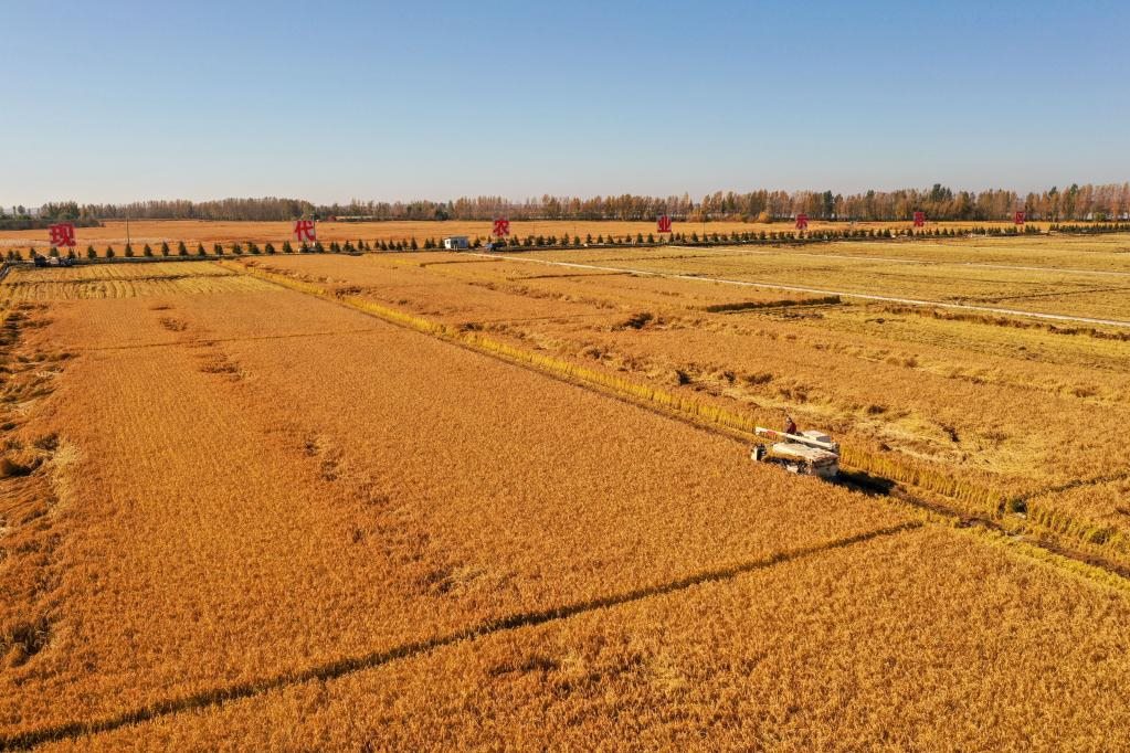 2021年10月12日,在吉林省吉林市永吉縣萬昌鎮(zhèn),農(nóng)民駕駛農(nóng)機(jī)收割水稻(無人機(jī)照片)。新華社記者張楠攝