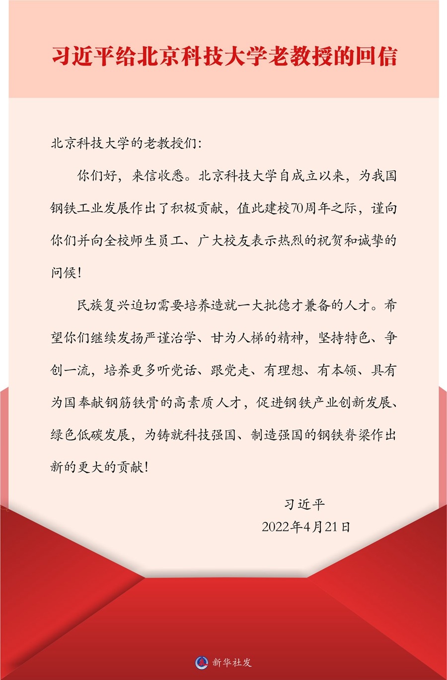 中共中央總書記、國(guó)家主席、中央軍委主席習(xí)近平4月21日給北京科技大學(xué)的老教授回信,對(duì)培養(yǎng)更多高素質(zhì)人才,促進(jìn)鋼鐵產(chǎn)業(yè)創(chuàng)新發(fā)展、綠色低碳發(fā)展提出殷切期望。