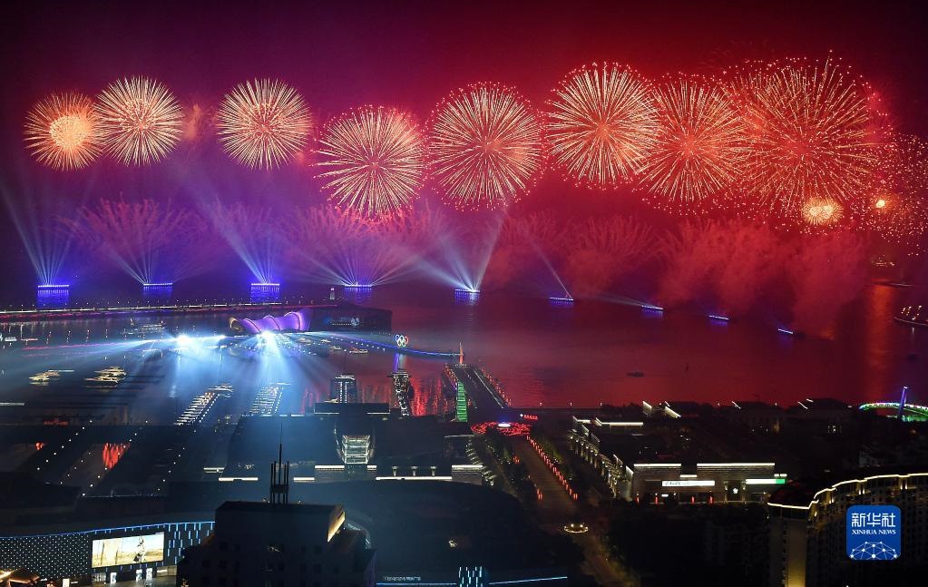 這是2018年6月9日晚在青島舉行的《有朋自遠方來》燈光焰火藝術(shù)表演。2018年6月9日至10日,上海合作組織成員國元首理事會第十八次會議在青島召開。新華社記者 李紫恒 攝