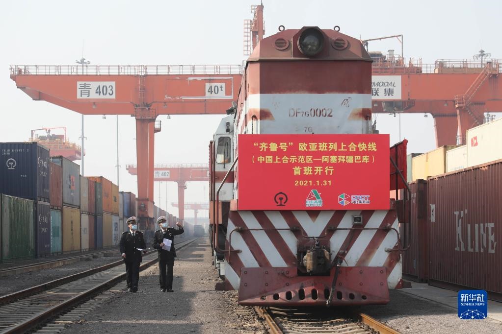 膠州海關(guān)關(guān)員對“齊魯號”歐亞班列上合快線(中國上合示范區(qū)——阿塞拜疆巴庫)線路首班列車進行檢查(2021年1月31日攝)。新華社發(fā)(解豪攝)