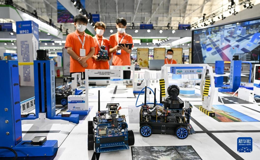 在天津舉行的世界職業(yè)技術(shù)教育發(fā)展大會(huì)首屆世界職業(yè)院校技能大賽上,參賽選手在實(shí)訓(xùn)沙盤前操作機(jī)器人設(shè)備(2022年8月20日攝)。新華社記者 孫凡越 攝