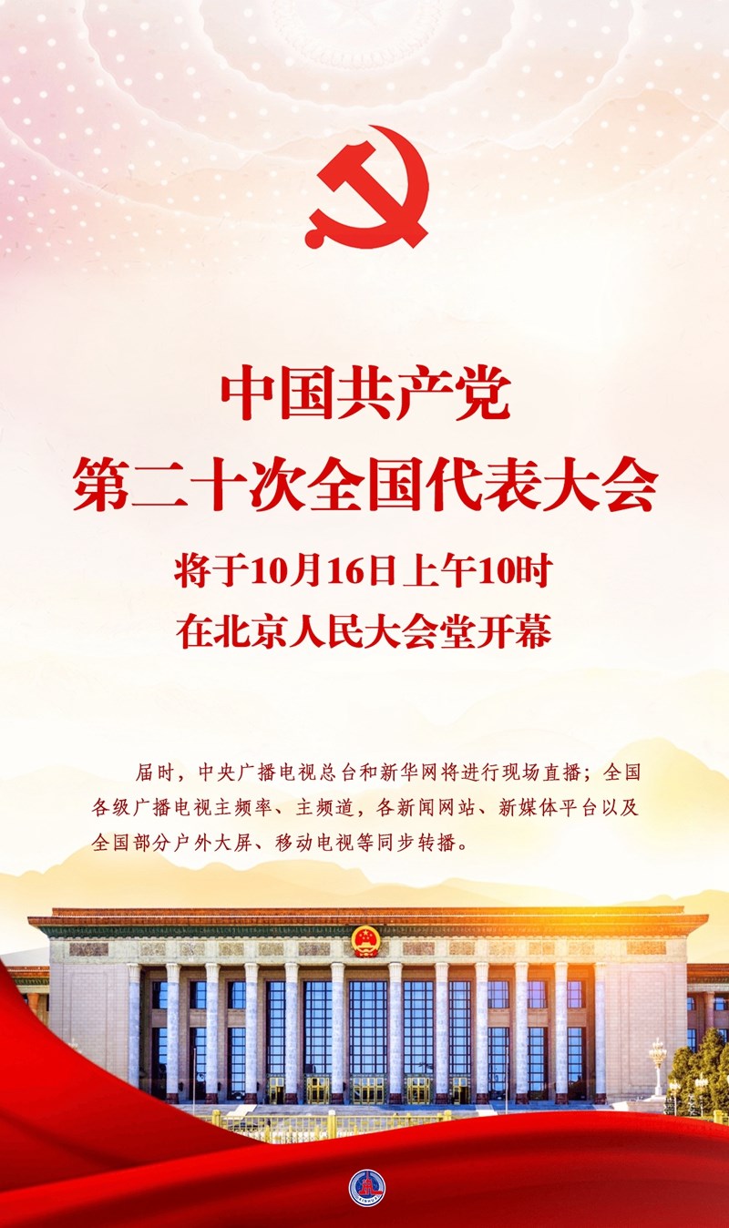 新華社北京10月14日電 中國共產(chǎn)黨第二十次全國代表大會將于16日上午10時在北京人民大會堂開幕。