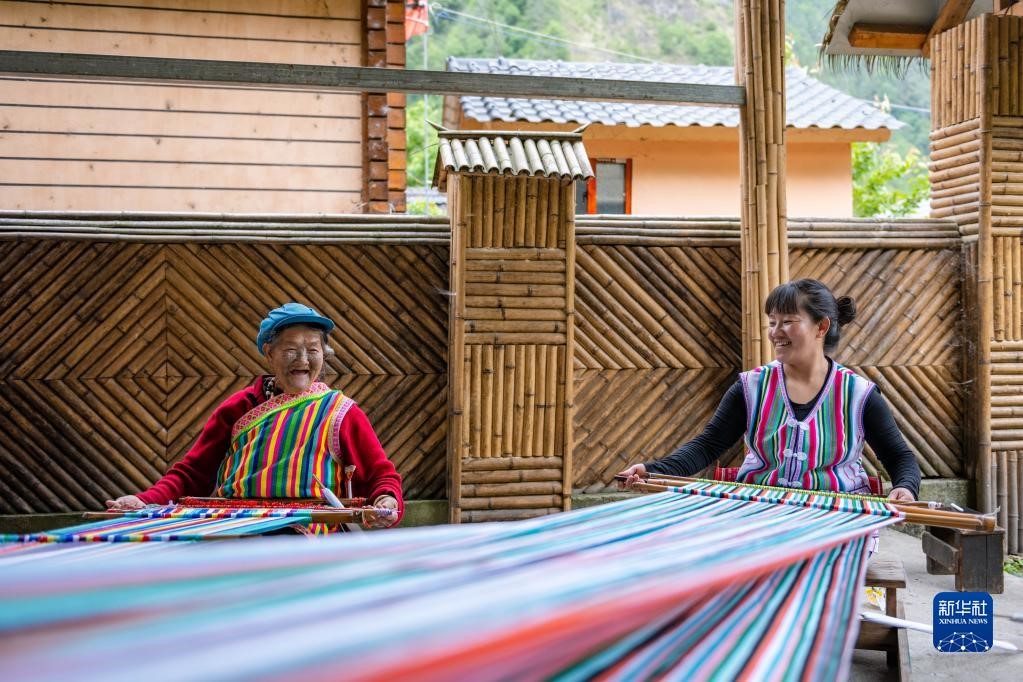 在云南省貢山獨龍族怒族自治縣獨龍江鄉(xiāng)迪政當(dāng)村,獨龍族老人李文仕(左)和女兒在編織獨龍?zhí)海?022年5月10日攝)。新華社記者 曹夢瑤 攝