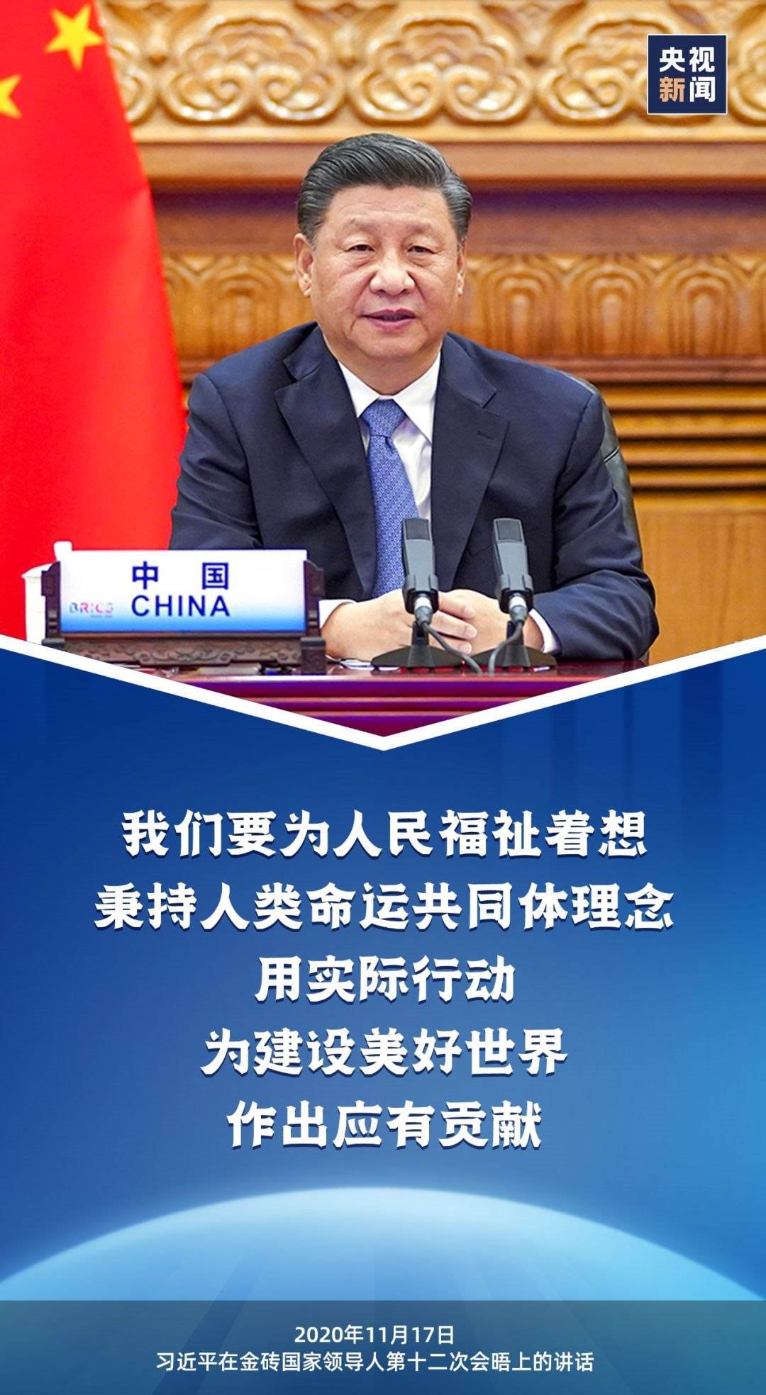 2020年11月17日,國家主席習(xí)近平出席金磚國家領(lǐng)導(dǎo)人第十二次會晤并發(fā)表重要講話時指出,“我們要為人民福祉著想,秉持人類命運共同體理念,用實際行動為建設(shè)美好世界作出應(yīng)有貢獻(xiàn)?!?/p>