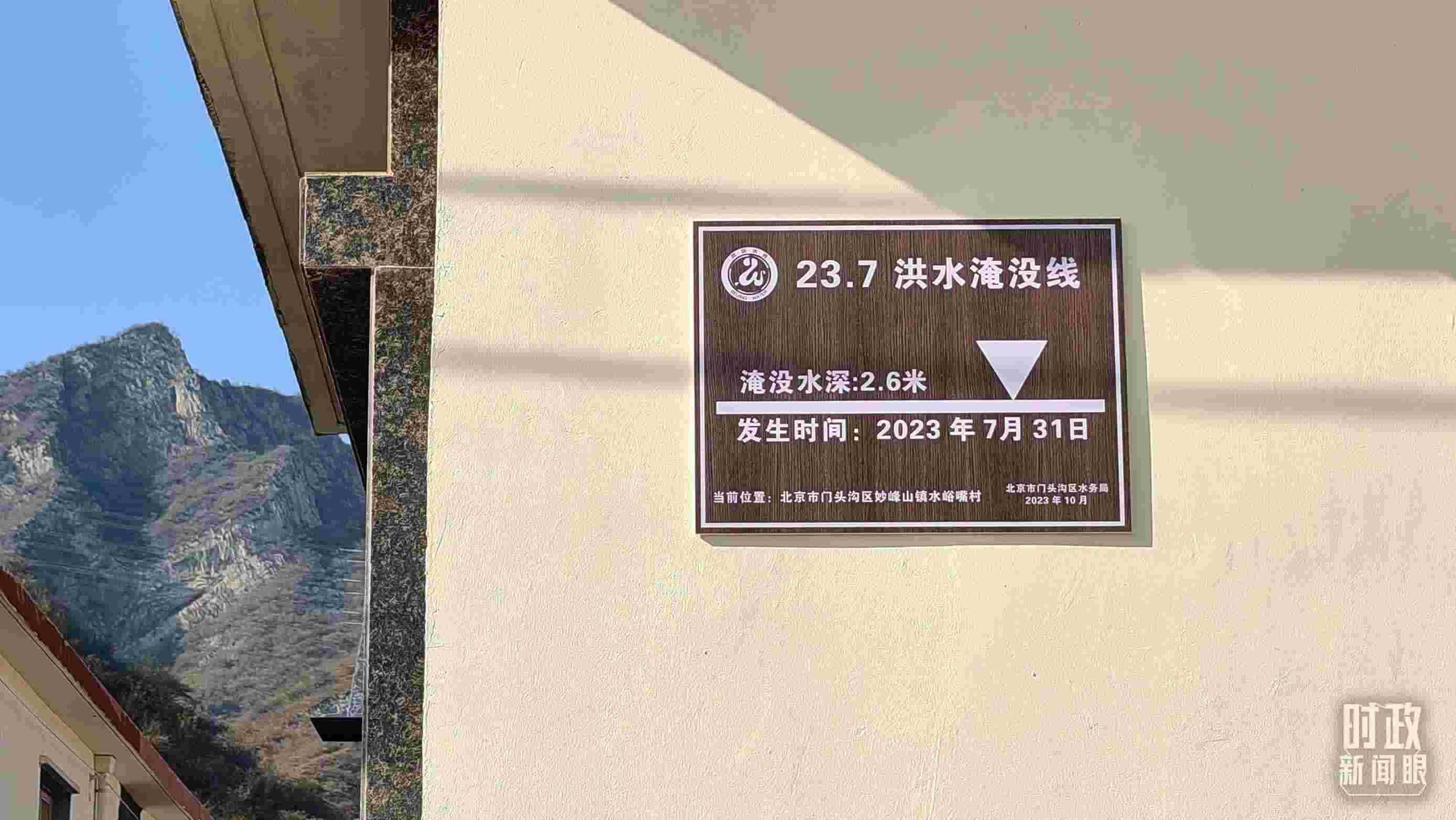 △ 村民房屋外設(shè)立了洪水淹沒(méi)線的標(biāo)牌。(總臺(tái)央視記者賈林拍攝)