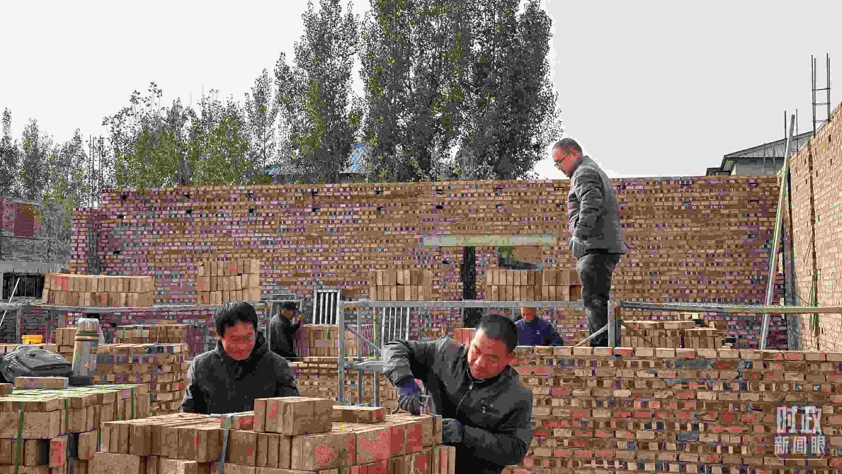 △ 刁窩鎮(zhèn)萬(wàn)全莊村,施工隊(duì)在建設(shè)新房。(總臺(tái)央視記者郁振一拍攝)