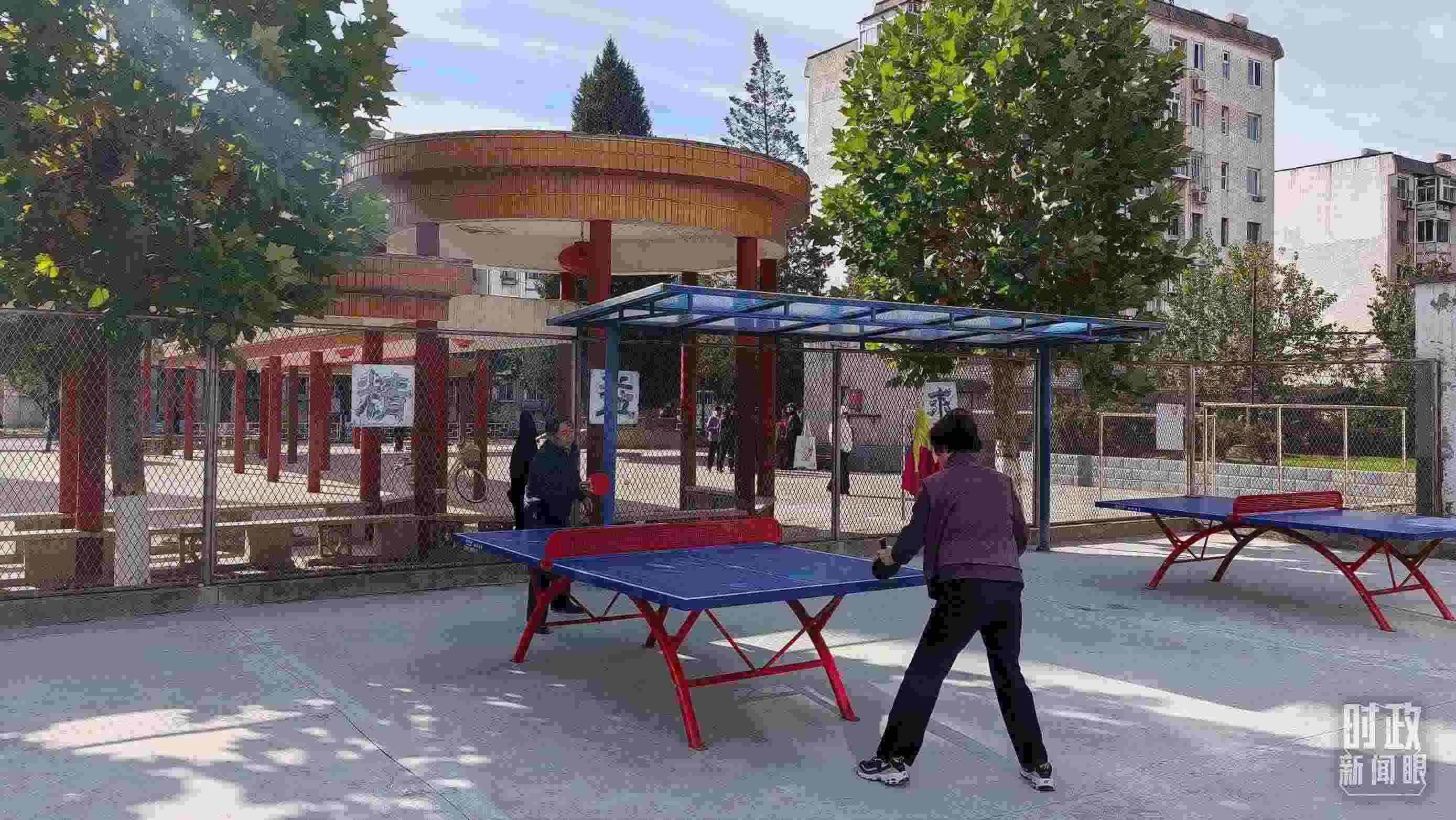 △ 涿州永濟(jì)秀園小區(qū)里的居民正在戶外打乒乓球。(總臺(tái)央視記者王萌萌拍攝)