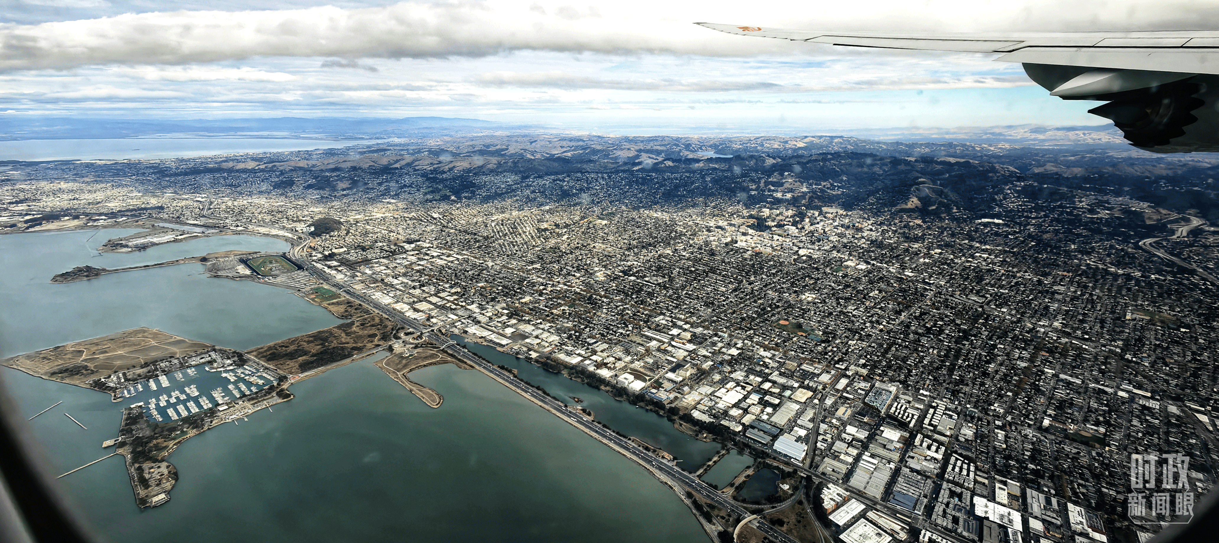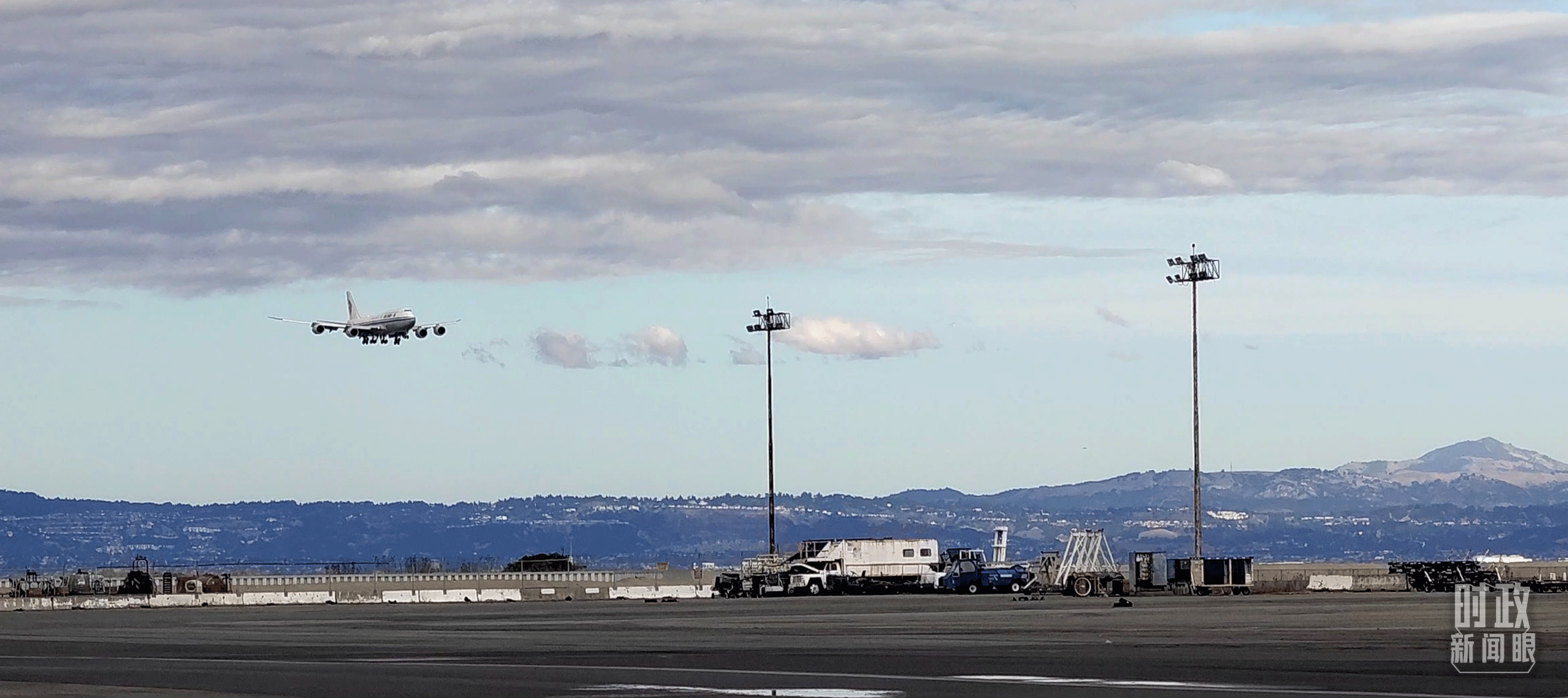 △習(xí)近平乘坐的專機即將降落舊金山國際機場。(總臺央視記者張曉鵬拍攝)