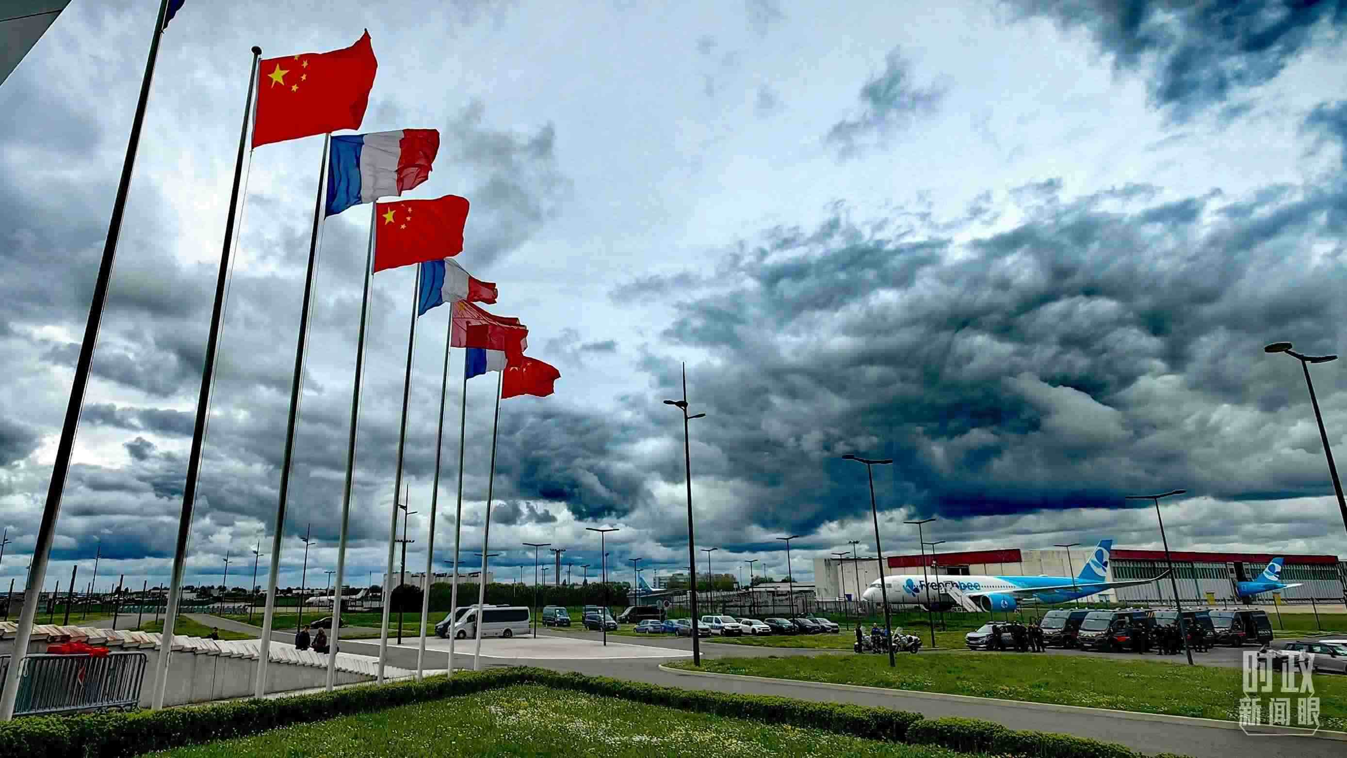 △巴黎奧利機(jī)場,中法兩國國旗迎風(fēng)招展。(總臺央視記者段德文拍攝)