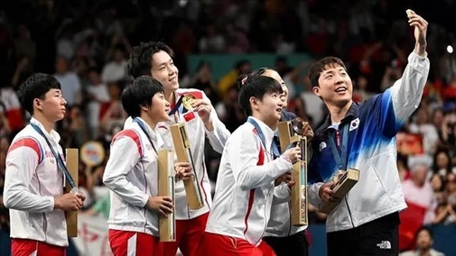 △巴黎奧運(yùn)會(huì)乒乓球混合雙打頒獎(jiǎng)儀式結(jié)束后,中朝韓運(yùn)動(dòng)員聚到一起合影的場(chǎng)景,在朋友圈刷了屏。