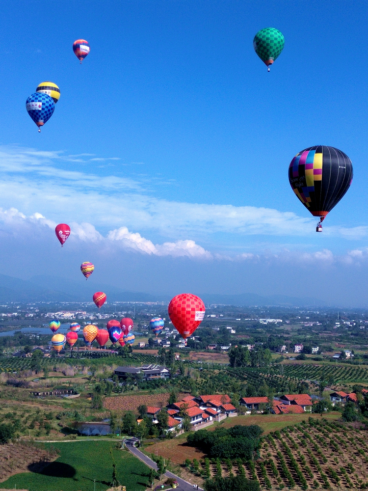 隨著開幕儀式的推進(jìn),30支熱氣球依次完成點(diǎn)火、充氣,在歡呼聲中緩緩升空。紅黃藍(lán)綠的熱氣球與郁郁蔥蔥的柑橘園、錯落有致的川西民居相映成趣,構(gòu)成一幅絕美畫卷。據(jù)了解,此次全國熱氣球精英賽(四川金堂站)作為活動核心賽事,將在10月15日-19日期間開展游蕩華爾茲、定點(diǎn)投靶、肘形飛行等10余項(xiàng)專業(yè)競技項(xiàng)目,最讓人期待的是本次賽事將熱氣球飛躍龍泉山作為了長距離飛行的競賽科目,這將是熱氣球首次飛越龍泉山。屆時,參賽選手在比賽的同時還可以在空中觀賞龍泉山脈、千里沱江、絕美古剎等景觀。