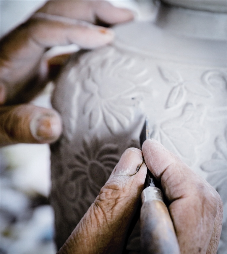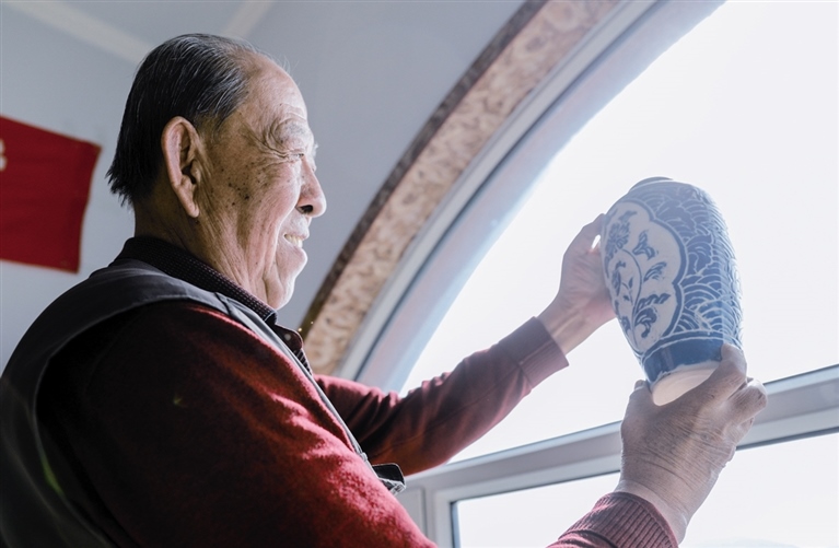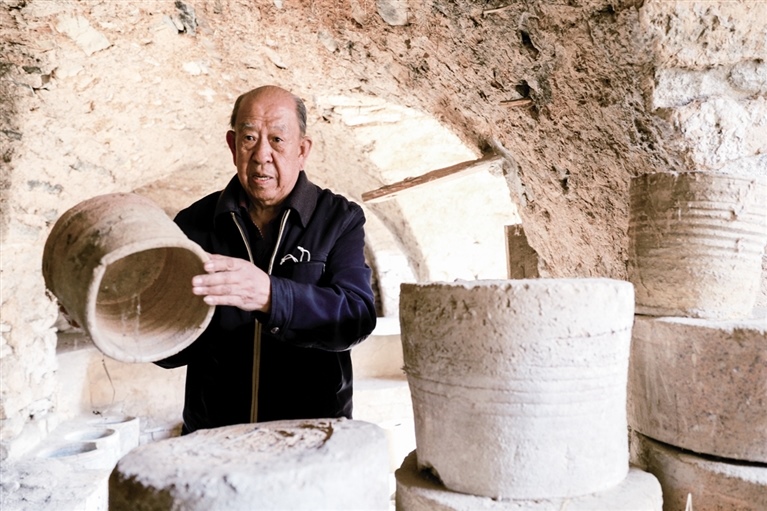 隨后,他走進(jìn)“饅頭窯”旁邊的一口窯洞,這是當(dāng)時張家的一間手工作坊,揉泥、拉坯、上釉等一系列制作陶瓷的工序都是在這里完成?!拔揖统錾谶@個村子,已經(jīng)是張家瓷藝的第九代傳人了。作為中國磁州窯譜系,清水河黑礬溝瓷藝生產(chǎn)歷史至少已有800年?!标P(guān)于這項非遺的歷史故事,張選老人向記者娓娓道來:大約400年前,他們張家走西口從山西來到清水河謀生,當(dāng)時清水河黑礬溝有一家姓杜的人家做陶瓷營生,張家的先人在杜家打工,大概這樣打工做了三輩人吧,杜家忽然不做了,搬離了黑礬溝,他們張家便把杜家的產(chǎn)業(yè)買了下來繼續(xù)做?!澳莻€時候黑礬溝生產(chǎn)的瓷器都與人們生活息息相關(guān),比如腌菜缸、水甕、碗盤等,一個家庭手工作坊一天能生產(chǎn)500個碗呢,生意很好,人們靠做這個營生也過上了不錯的生活。”張選回憶著清水河瓷藝鼎盛時期的場景。上個世紀(jì)70年代,由于交通、技術(shù)等原因,黑礬溝燃燒了幾百年的窯火熄滅,傳統(tǒng)“饅頭窯”被正式廢棄,轉(zhuǎn)移到窯溝鄉(xiāng)后手工作坊變成了機(jī)械化生產(chǎn),這也讓清水河的陶瓷名聲大噪。當(dāng)時,在窯溝鄉(xiāng)一帶,從事陶瓷生產(chǎn)的有近萬人,陶瓷業(yè)成為清水河支柱產(chǎn)業(yè)。
