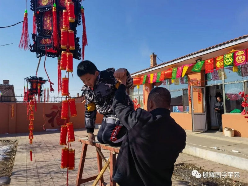 父親讓曈曈接地氣的愿望實(shí)現(xiàn)了,長(zhǎng)得越來越壯實(shí)的曈曈真是打心眼喜歡上了農(nóng)村,喜歡看叔叔大爺們是如何勞動(dòng)的。春天澆地的時(shí)候,他跟上我的發(fā)小利利到地里去,手里拿上一張鐵鍬學(xué)著去攏堰堤;秋收的時(shí)候他爬上了丁補(bǔ)元駕駛的收割機(jī),感受農(nóng)民們收割玉米的喜悅;接羔的時(shí)候,他又鉆進(jìn)利軍家的羊群里,抱著出生沒有幾天的小羊羔,給小羊羔喂牛奶……春節(jié)前的一兩天是他最忙的時(shí)候:一會(huì)跟上大爹貼春聯(lián),一會(huì)跟上茹義大爺掛紅燈,忙得不亦樂乎。前一段時(shí)間回村里他又要跟上利軍大爺出村放羊去,又要跟上茹義大爺去種玉米,在城里他是見識(shí)不到這些的。