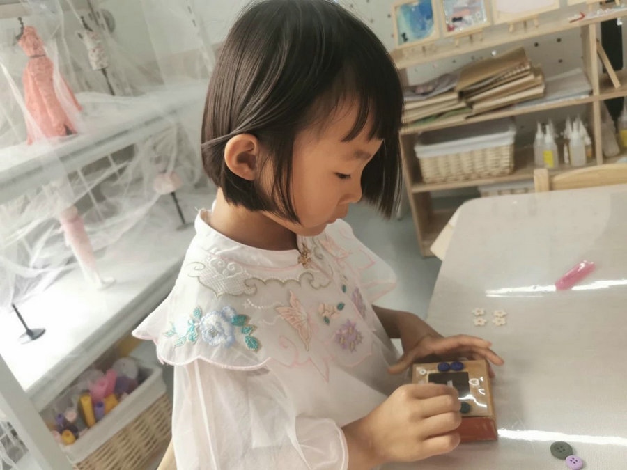 在布衣樣區(qū)域,小朋友親自制作艾草手工皂,通過繪畫艾草圖標(biāo)設(shè)計禮盒、制作艾草工皂,用做好的艾草洗手,感受成果的喜悅。(記者 楊凈毓)