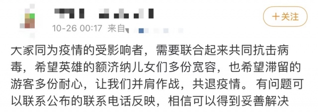 在社交媒體上,一名王姓女士通過短視頻呈現(xiàn)了一家人滯留額濟納的境況,在視頻中,她為同樣滯留在此的游客鼓勁:“如果你此時正在阿拉善,愿你如胡楊般堅強,積極應(yīng)對疫情?!边@條短視頻發(fā)出數(shù)小時,就吸引了20余萬瀏覽量。