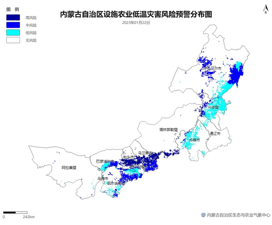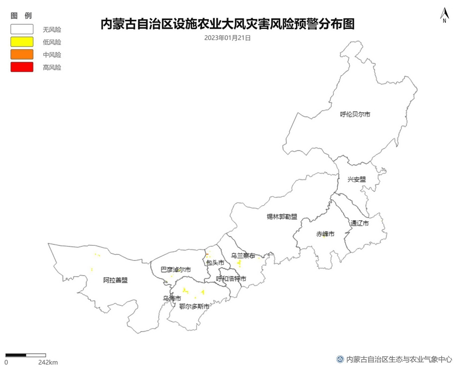 根據(jù)智能網(wǎng)格預(yù)報(bào)數(shù)據(jù),結(jié)合設(shè)施農(nóng)業(yè)低溫災(zāi)害和風(fēng)災(zāi)指標(biāo),1月21日至23日,呼倫貝爾市東南部、東南部偏西地區(qū)為設(shè)施農(nóng)業(yè)低溫災(zāi)害低風(fēng)險(xiǎn)地區(qū),東北部中部及東部、中部偏南大部、西部偏東部分地區(qū)為設(shè)施農(nóng)業(yè)低溫災(zāi)害中或高風(fēng)險(xiǎn)地區(qū),低溫災(zāi)害將導(dǎo)致作物生長(zhǎng)緩慢和受凍;21至23日,東南部部分地區(qū)、中部偏西南局部地區(qū)及鄂爾多斯市零星地區(qū)為設(shè)施農(nóng)業(yè)風(fēng)災(zāi)低風(fēng)險(xiǎn)地區(qū),其中,22日鄂爾多斯市北部零星地區(qū)、23日錫林郭勒盟東部零星地區(qū)、烏蘭察布市中部局部地區(qū)為設(shè)施農(nóng)業(yè)風(fēng)災(zāi)中或高風(fēng)險(xiǎn)地區(qū),風(fēng)災(zāi)易造成溫室結(jié)構(gòu)受損。