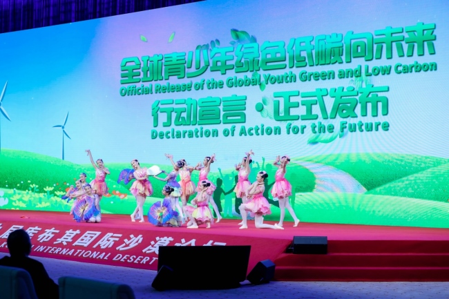 中福會(huì)少年兒童代表在論壇會(huì)議舞臺(tái)上帶來了創(chuàng)意獨(dú)特的“青少年、沙漠、未來”特別活動(dòng)。通過少兒舞蹈與數(shù)字人互動(dòng)表演的創(chuàng)新形式發(fā)布“全球綠色低碳發(fā)展青少年宣言”。