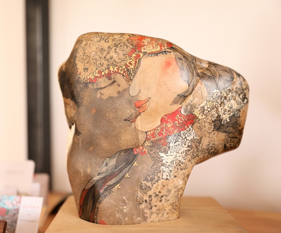 4月27日,內蒙古烏海西行客棧,魯婷在她的黃河石畫工作室,向記者介紹她創(chuàng)作的石畫作品。
