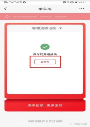 開通成功后,點擊“去乘車”獲取乘車二維碼,在進、出閘機對應區(qū)域掃描二維碼即可。