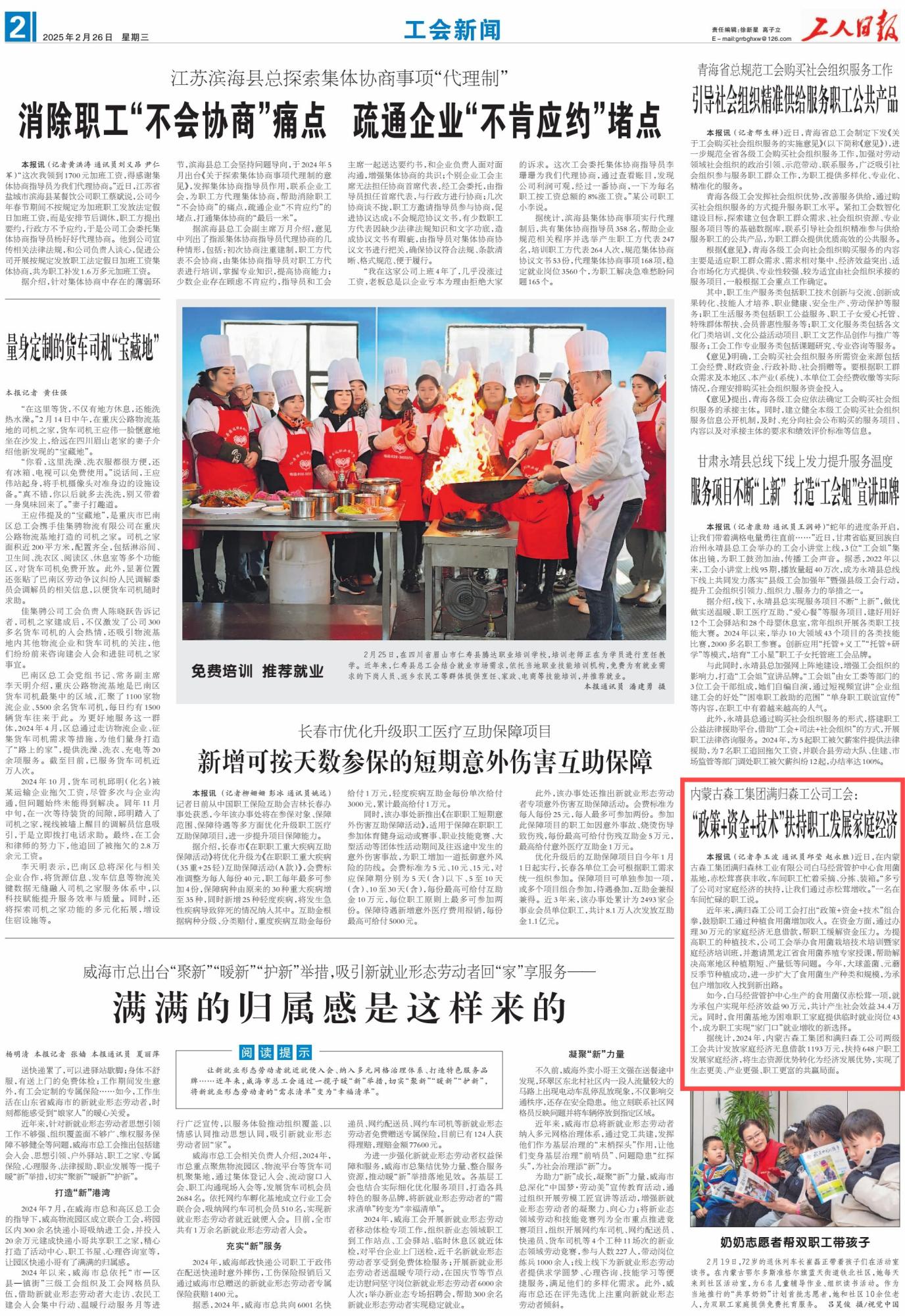 2025年2月26日,《工人日報》第2版刊發(fā)題為《內(nèi)蒙古森工集團滿歸森工公司工會:“政策+資金+技術(shù)”扶持職工發(fā)展家庭經(jīng)濟》的消息,介紹了近年來,內(nèi)蒙古森工集團滿歸森工公司工會打出“政策+資金+技術(shù)”組合拳,鼓勵職工通過種植食用菌增加收入。
