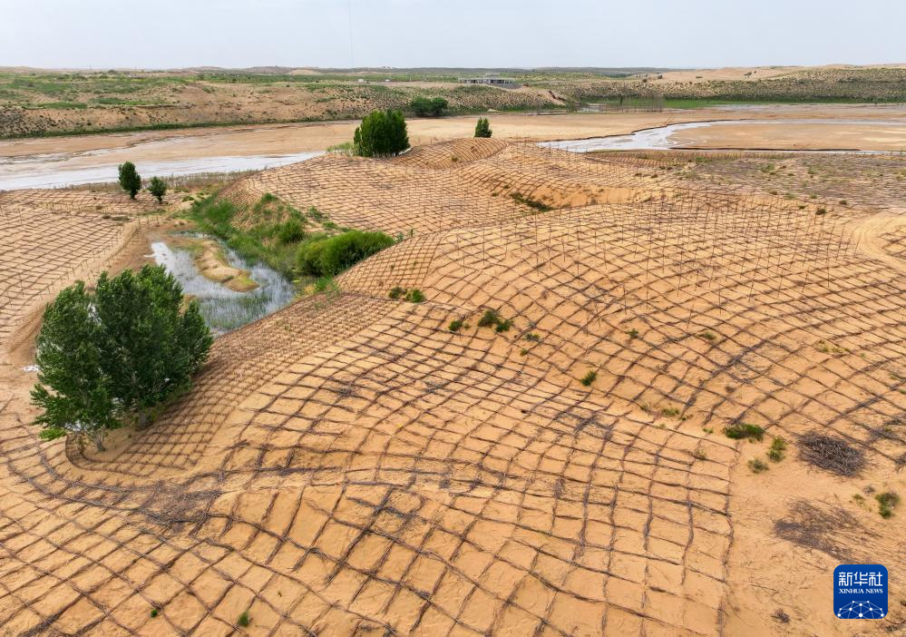 6月7日,在鄂爾多斯市達拉特旗境內(nèi)的庫布其沙漠,工人在治沙(無人機照片)新華社記者 李志鵬 攝