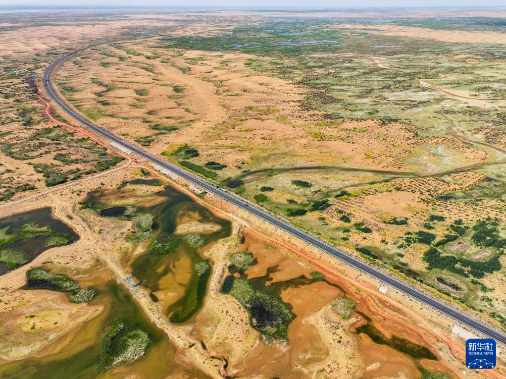 在鄂爾多斯市杭錦旗庫布其沙漠,穿沙公路兩側(cè)綠意蔥蘢(6月6日攝,無人機照片)新華社記者 連振 攝