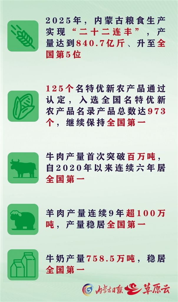 從河套平原的繁忙備耕到錫林郭勒草原的牛羊成群,再到敕勒川的奶香四溢,內(nèi)蒙古以“糧倉”更實(shí)、“肉庫”更足、“奶罐”更豐的堅實(shí)底氣,扛起建設(shè)國家重要農(nóng)畜產(chǎn)品生產(chǎn)基地的使命擔(dān)當(dāng)。