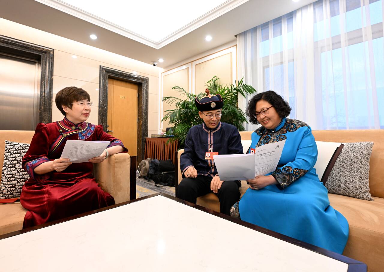 3月4日,住內(nèi)蒙古全國(guó)政協(xié)委員杜明燕(右)、納日碧力戈(中)、鄂曉梅(左)就全國(guó)政協(xié)常委會(huì)工作報(bào)告中共同關(guān)注的話題進(jìn)行交流。草原云記者 韓卿立