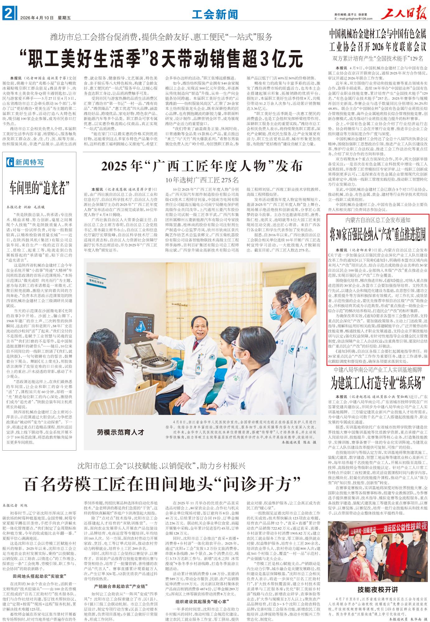 2026年4月10日,《工人日?qǐng)?bào)》第2版刊發(fā)題為《內(nèi)蒙古自治區(qū)總工會(huì)發(fā)布通知 將30家百?gòu)?qiáng)民企納入“產(chǎn)改”重點(diǎn)推進(jìn)范圍》的文章,報(bào)道了內(nèi)蒙古自治區(qū)總工會(huì)發(fā)布《關(guān)于進(jìn)一步加強(qiáng)全區(qū)百?gòu)?qiáng)民營(yíng)企業(yè)深化產(chǎn)業(yè)工人隊(duì)伍建設(shè)改革工作的通知》,明確將本盟市區(qū)域內(nèi)尚未列入“產(chǎn)改”項(xiàng)目試點(diǎn)、綜合示范點(diǎn)或助推企業(yè)名單的30家自治區(qū)民企100強(qiáng)企業(yè),全部納入本級(jí)“產(chǎn)改”重點(diǎn)推進(jìn)企業(yè)范圍,實(shí)現(xiàn)百?gòu)?qiáng)民企“產(chǎn)改”工作全覆蓋。