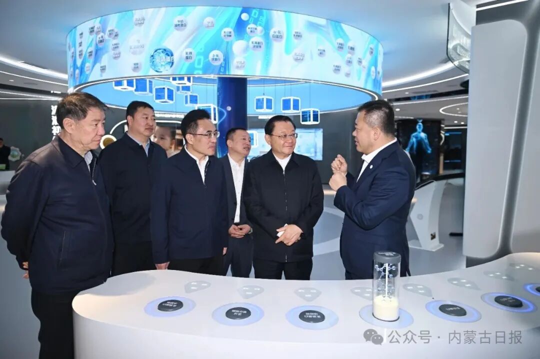 4月22日,自治區(qū)黨委書記、人大常委會主任王偉中在蒙牛集團聽取企業(yè)全球布局、技術研發(fā)等情況介紹。草原云·內蒙古新聞網(wǎng)記者 馬建兵 攝