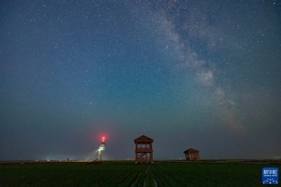 夏日夜晚,黑龍江省富錦市萬(wàn)畝水稻公園的稻田之上星空璀璨,美麗壯觀。