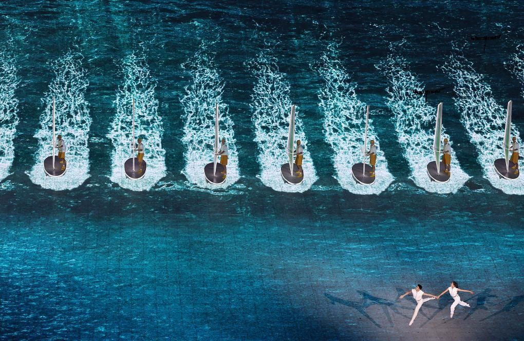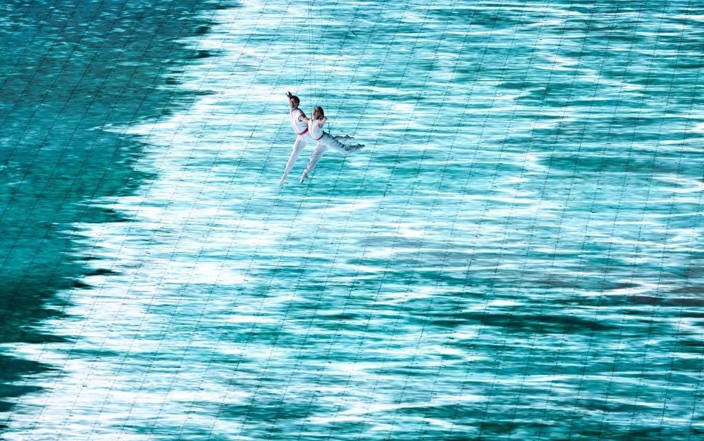 本屆亞運會首次將3D雙威亞技術(shù)應用于大型運動場中。立體飛旋于空中的男女演員與潮共舞,吊著威亞的他們在空中完成了各種高難度動作,并與地屏中的浪潮實時互動,踏浪而行,成就了科技與藝術(shù)完美融合。