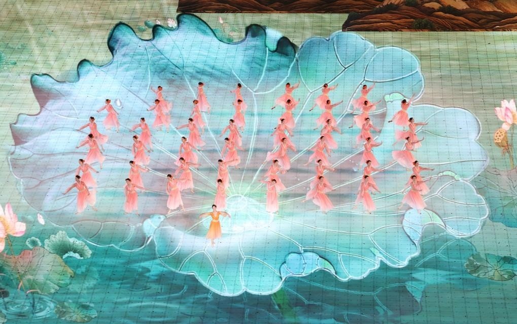 地屏上,錯落有致的立體山水映襯著江南朦朧的裸眼3D視效,營造出輕煙繚繞、水光瀲滟的江南畫境。國風男子揮毫作畫,風雅錢塘展現(xiàn)在觀眾眼前。煙雨西湖上,碩大的蓮葉舒展,清雅雋秀的女子翩然起舞,仿若盛開的蓮花。