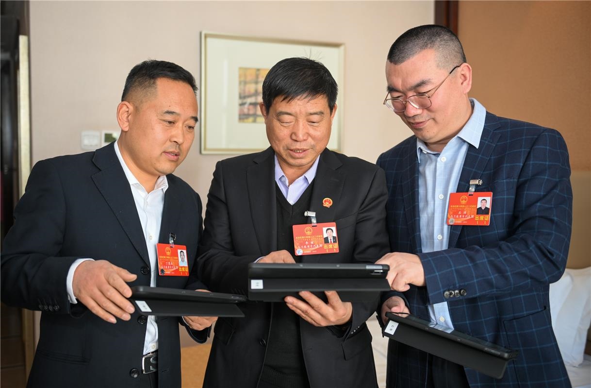 出席自治區(qū)十四屆人大二次會(huì)議的人大代表丁慧杰(左)、李?。ㄖ校?、石海認(rèn)真研讀會(huì)議材料。